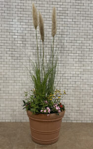 5号館のエントランスは一足早く秋の気配を感じさせます。今月の花は、パンパスグラス、紅富士、ゴシキトウガラシ、ルドベキア タカオ、フジバカマです。