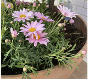 マーガレットローリーは淡いピンクの一重咲きで、花のサイズは3~4cmです。マーガレットは開花初期に色が濃く出て、その後は色あせていくのが一般的ですが、ローリーは退色しにくく、比較的鑑賞期間が長く保てます。分枝が良く枝数が多いので、沢山の花をコンパクトに咲かせてくれます。